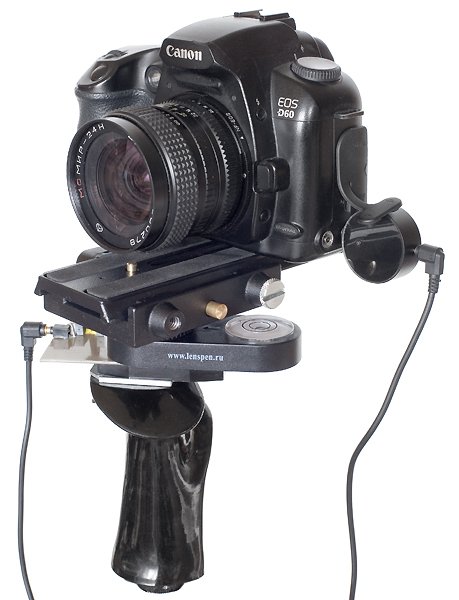 Теперь приступаем к сборке собственного устройства. Вся установка получается все равно не легкая, поэтому ее нужно комфортно держать, для этого я взял рукоятку от камеры Киев 88. К ней прикрепил устройство для съемки панорам Panamatic фирмы Lenspen. На него установил салазки фирмы Manfrotto №357. Из всего многообразия продукции фирмы эти самые дешевые, около тысячи рублей. У них нет микрометрических винтов для перемещения площадки, только эксцентриковый фиксатор. Но поскольку предполагается использовать объектив с постоянным фокусным расстоянием, то расстояние нужно выставить всего один раз, и устройства точного перемещения нам не нужны. Поскольку панорама всегда снимается объективом, установленным на гиперфокальное расстояние, то автофокусные объективы не просто не нужны, они вредны. Выбирая из имеющихся у меня объективов, я решил воспользоваться объективом Мир-24 Н.