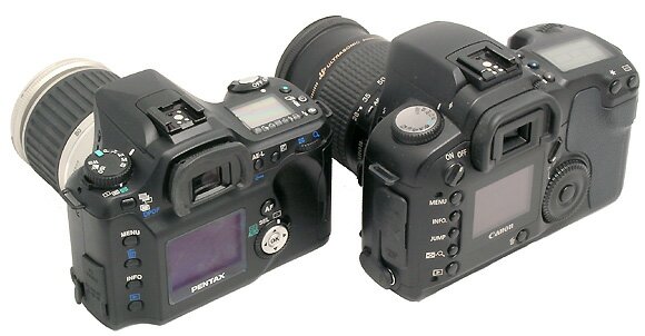 Камеры Pentax *istD и Canon D60 с однотипными бюджетными объективами 28-80 мм.