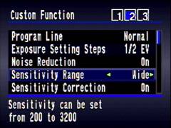 В меню обращают на себя внимание два пункта, объединенные синей рамкой: Sensitivity Rang и Sensitivity Correction. Первый дает возможность расширить диапазон значений индекса экспозиции до 3200 ISO. Необходимость в специальном пункте меню связана с другим возможным выбором, а именно, включение коррекции экспозиции; в этом случае при недостатке освещения камера сама переключает чувствительность, и в этом случае уже важно определить, будет она это делать в широких или узких пределах.