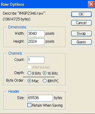 Размер кадра 3040×2024; Header 65536 (Byte Order Mac)