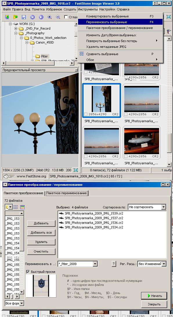 Если требуется задать более детальные имена отдельным файлам, я это делаю в FastStone Image Viewer. Чтобы переименовать несколько файлов, их нужно выбрать в режиме просмотра миниатюр и вызвать команду «переименовать выбранное»: