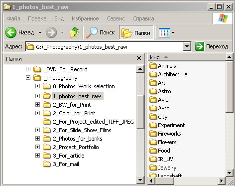 После записи данных на DVD в папке «Для записи» еще остаются данные. Теперь их можно «разбросать» по тематическим папкам со снимками и целевым папкам оперативного архива. Тематические папки со снимками это подборки лучших снимков тех тем, на которые вы снимаете. Это подборки по темам для которых еще не ясно, как их можно использовать. Главная их особенность — высокое качество. Целевые папки — папки для конкретных текущих задач: печать, подготовка слайд-фильмов, для фотобанков, для конкретных заказов. «Разбрасывание» снимков производится копированием в тематические и целевые папки с помощью все той же программы FastStone Image Viewer.