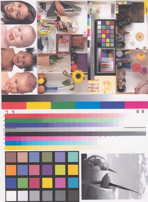 Мы, как и в предыдущих статьях, будем сравнивать отпечатки на оригинальных материалах, выполненные штатно (драйвер), с отпечатками, выполненными на оригинальных и неоригинальных материалах с помощью профиля, построенного PrintFix. Все иллюстрации отсканированы с одинаковыми настройками сканером Epson 4870, поэтому вполне можно составить впечатление о том, похожи или не похожи отпечатки, выполненные разными способами. В качестве мишени для оценки использовалась цифровая мишень PrintFix из комплекта и те же шкалы и изображение, которые использовались в предыдущих статьях.