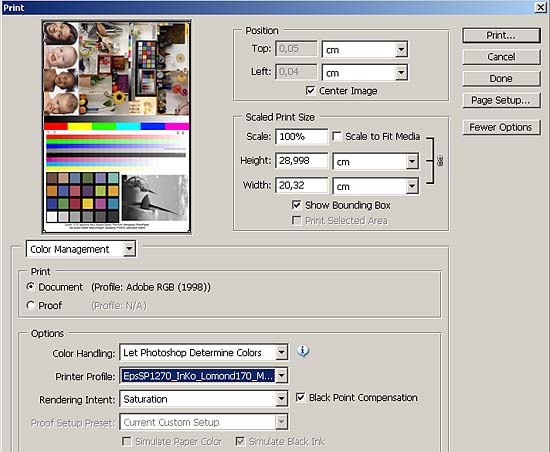 После того, как профиль построен, его можно использовать для печати с профилем. Для этого нужно в приложении, поддерживающем управление цветом, выбрать режим печати с профилем. Один из вариантов печати с профилем в Photoshop состоит в том, чтобы оставить изображение в его собственном цветовом пространстве (или это может быть рабочее пространство Photoshop), открыть окно «Печать с предпросмотром» и в нем выбрать режим «Photoshop управляет цветом» — «Профиль принтера-бумаги-чернил»: