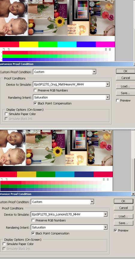 Профиль принтера работает в «двух направлениях», то есть он позволяет не только корректно преобразовать цифровой файл в его собственном рабочем пространстве в пространство принтера, но и имитировать «цвет» принтера на дисплее компьютера (об этом уже было написано в прошлых статьях на тему профилирования). PrintFix строит профили, позволяющие вполне адекватно оценивать будущий результат, если ваш монитор калиброван. Сходство конечно далеко от «полного», но впечатление от имитации «правильное» и его можно использовать для окончательной обработки отпечатка перед печатью. Для этого нужно лишь включить опцию Photoshop — «Экранные цветопробы», настроив предварительно режим этих цветопроб (выбрать профиль, метод воспроизведения цвета и режим передачи точки «черного»).
