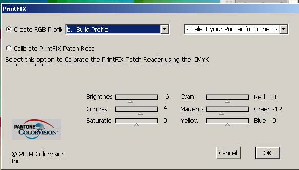 У Pantone ColorVision кроме программных решений, есть и сравнительно недорогое аппаратно-программное для построения профилей — комплект Pantone ColorVision PrintFIX. Он состоит из программы и неспециального, но калибруемого под эту задачу сканера. Цена комплекта сопоставима с ценой хорошего принтера формата А3+. И для покупки его должны быть веские причины. Например, эффективность его должна быть «соизмерима» с эффективностью самого принтера и, в частности, с эффективностью драйвера принтера при работе, как с оригинальными, так и с неоригинальными материалами. Сомнений по поводу эффективности сравнительно «недорогих решений» (и разумности покупки) может добавить информация о ценах на «промышленные» устройства калибровки и ценах за заказной «профиль». О сложности задачи можно судить по тому, что «настоящие» не бытовые устройства настройки цвета для печатного процесса стоят как десяток, а то и больше бытовых принтеров, а цена за профиль близка к цене за принтер.