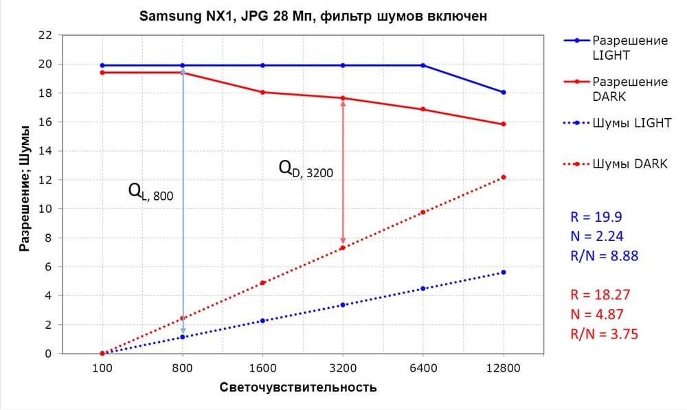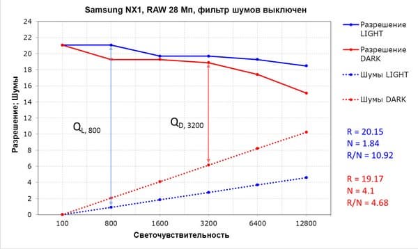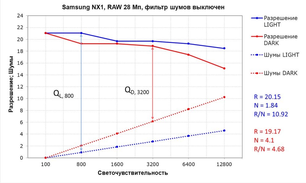 - R — среднее разрешение в диапазоне ISO 100 — 6400;