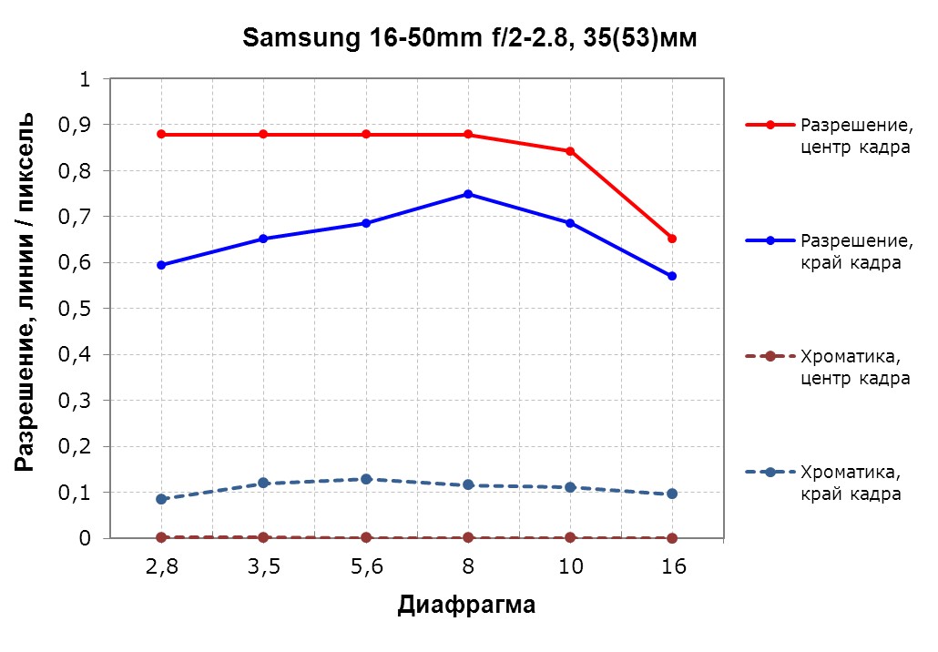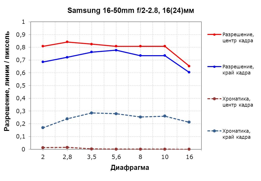 На среднем фокусном расстоянии уровень хроматики на краю становится меньше вместе с разрешением. А вот центр кадра выравнивается очень неплохо, поднимаясь на достаточно высокий уровень.