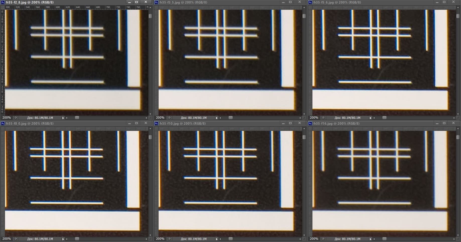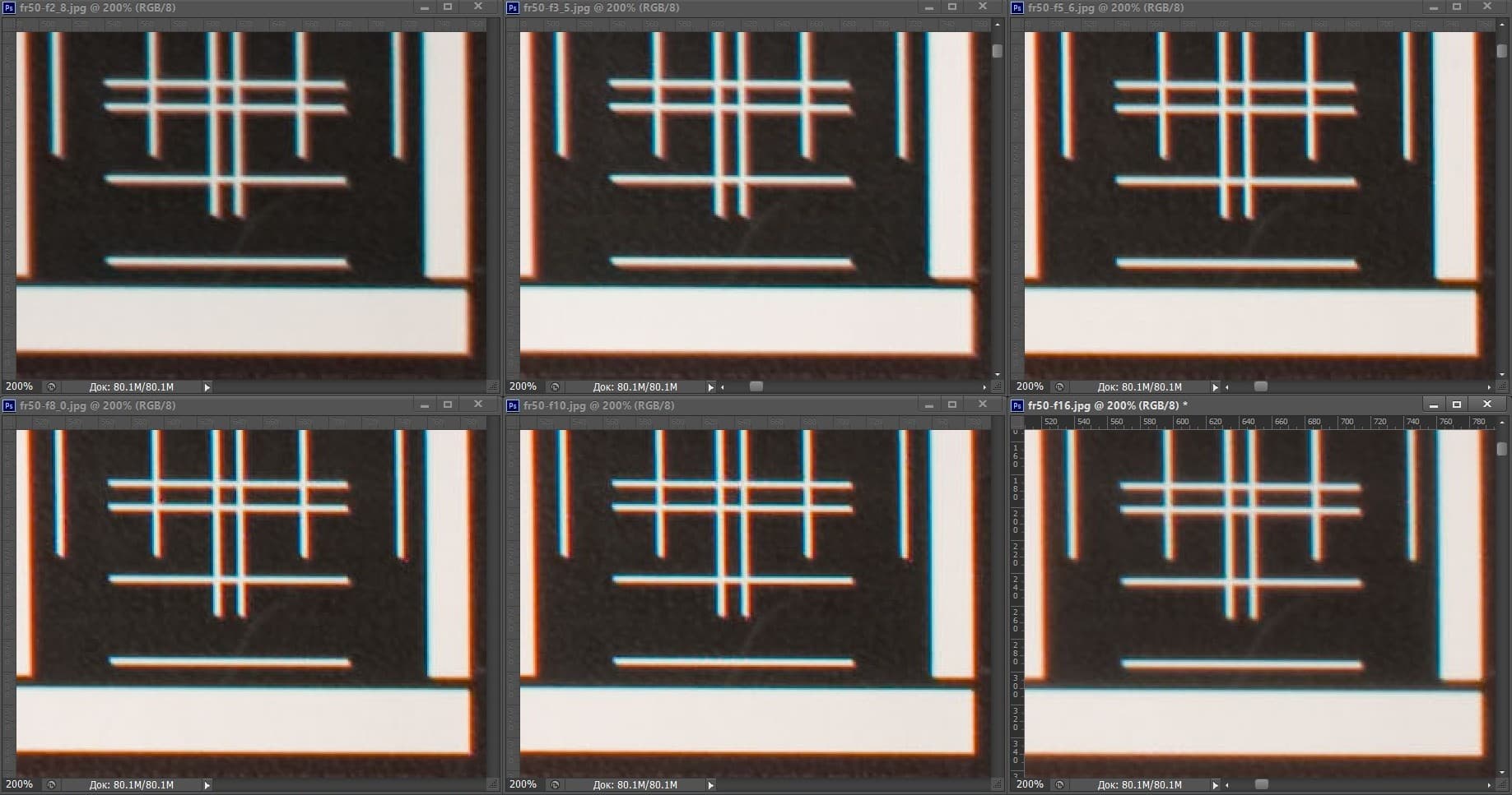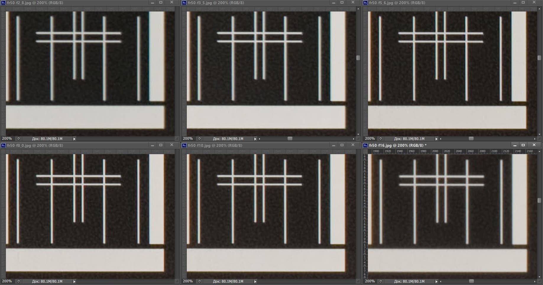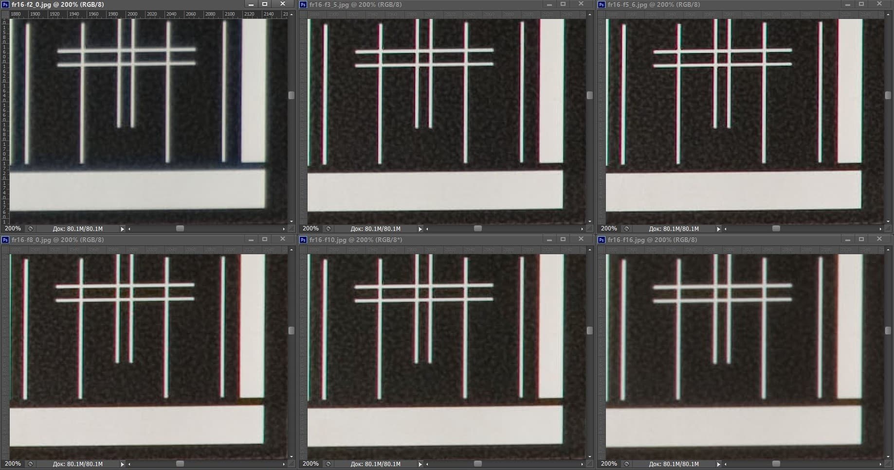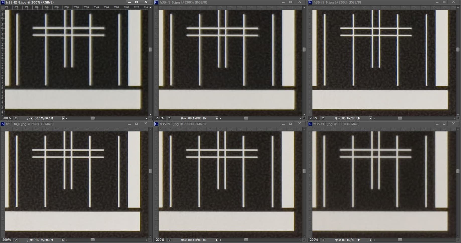| На всех скриншотах: верхний ряд: f/2,0 — f/3,5 — f/5,6; нижний ряд: f/8 — f/10 — f/16 | |||