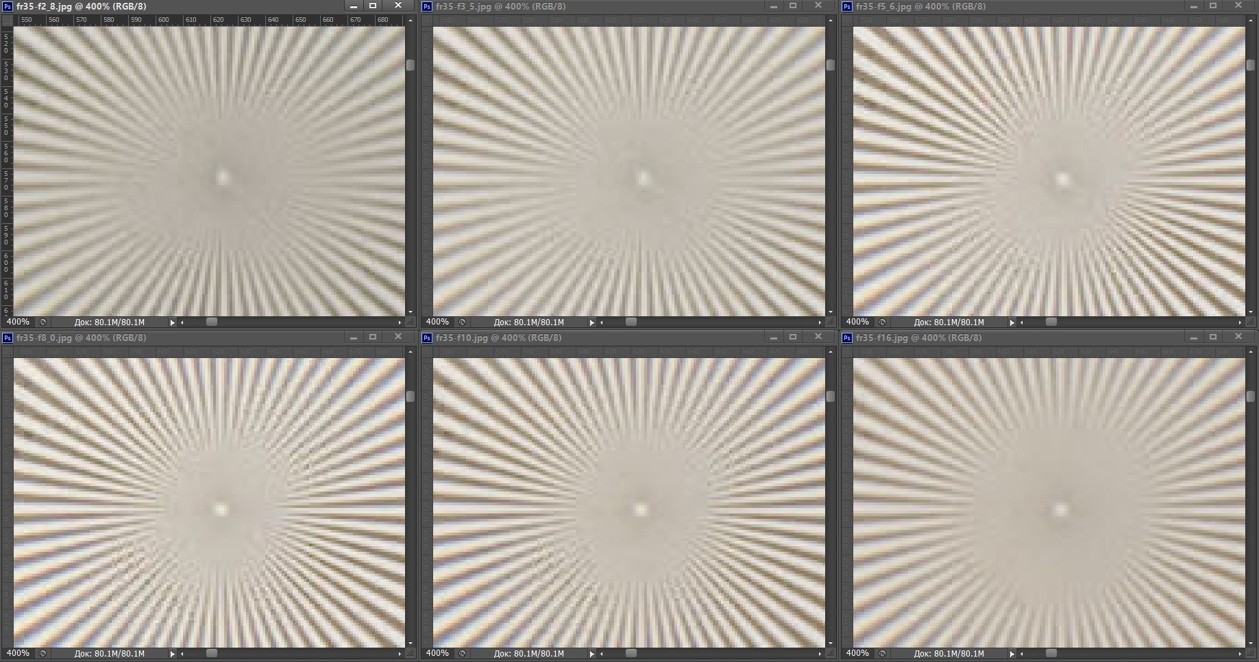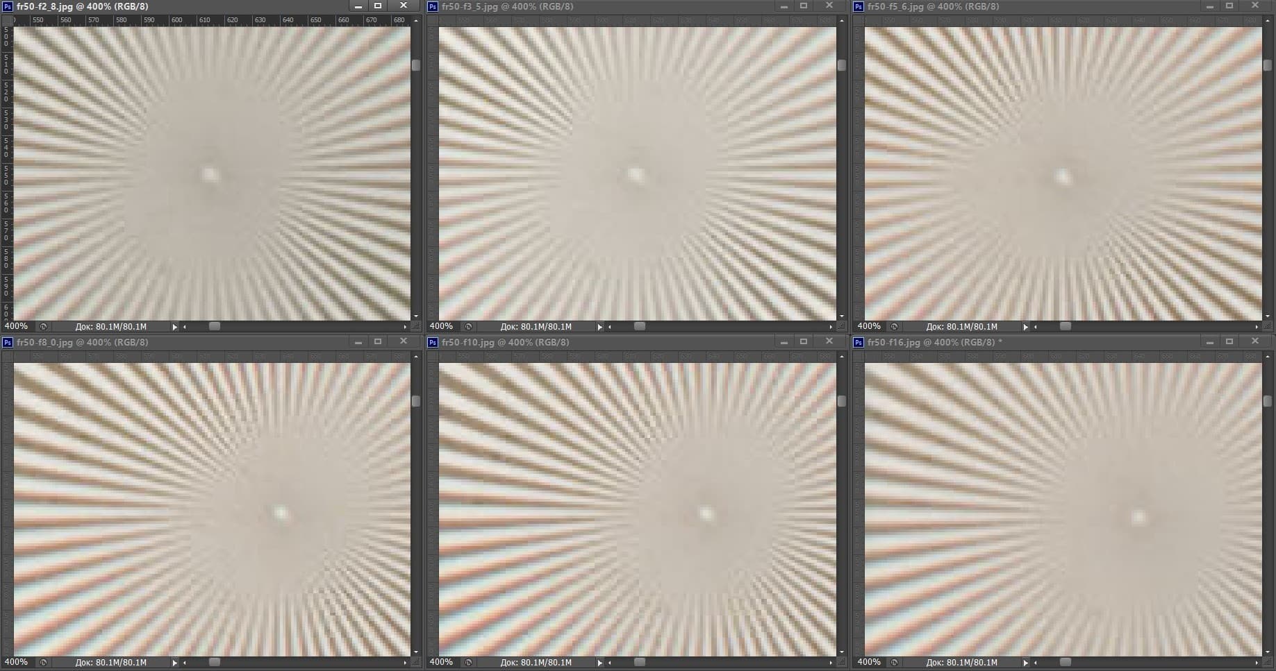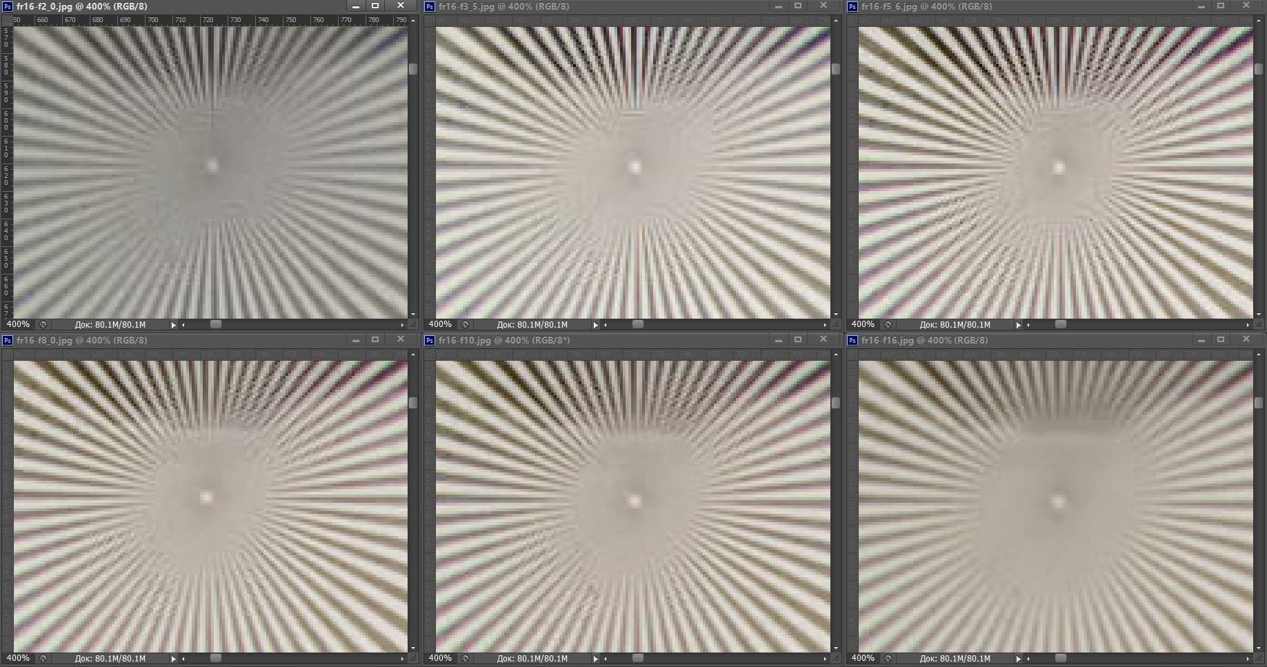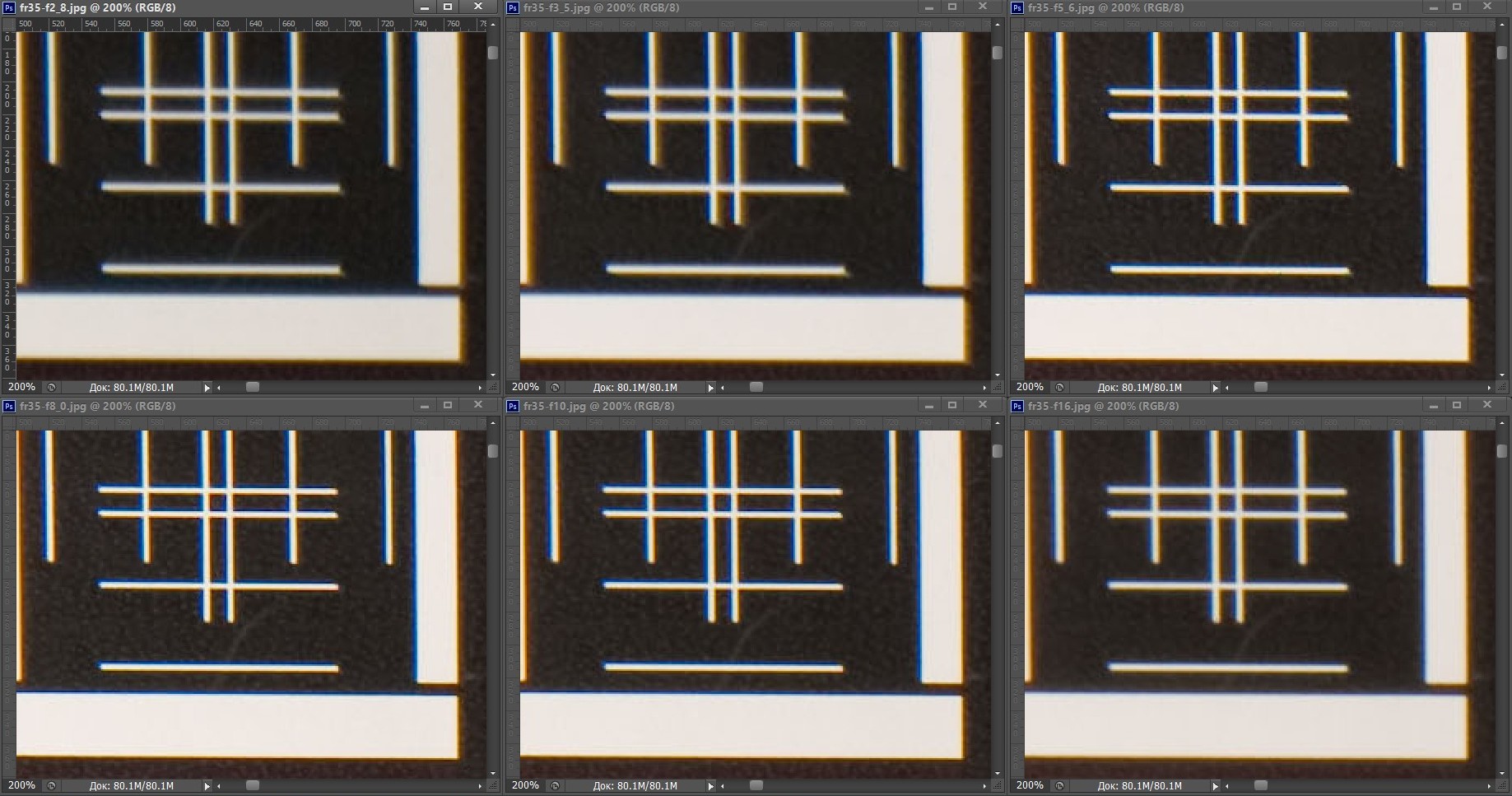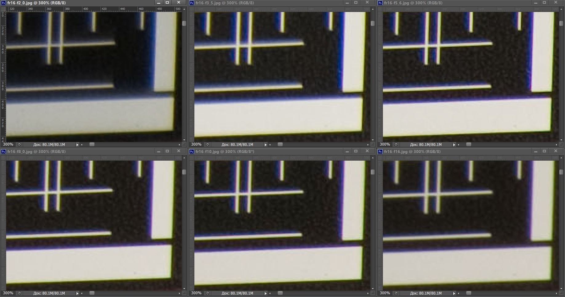 | На всех скриншотах: верхний ряд: f/2,8 — f/3,5 — f/5,6; нижний ряд: f/8 — f/10 — f/16 | |||