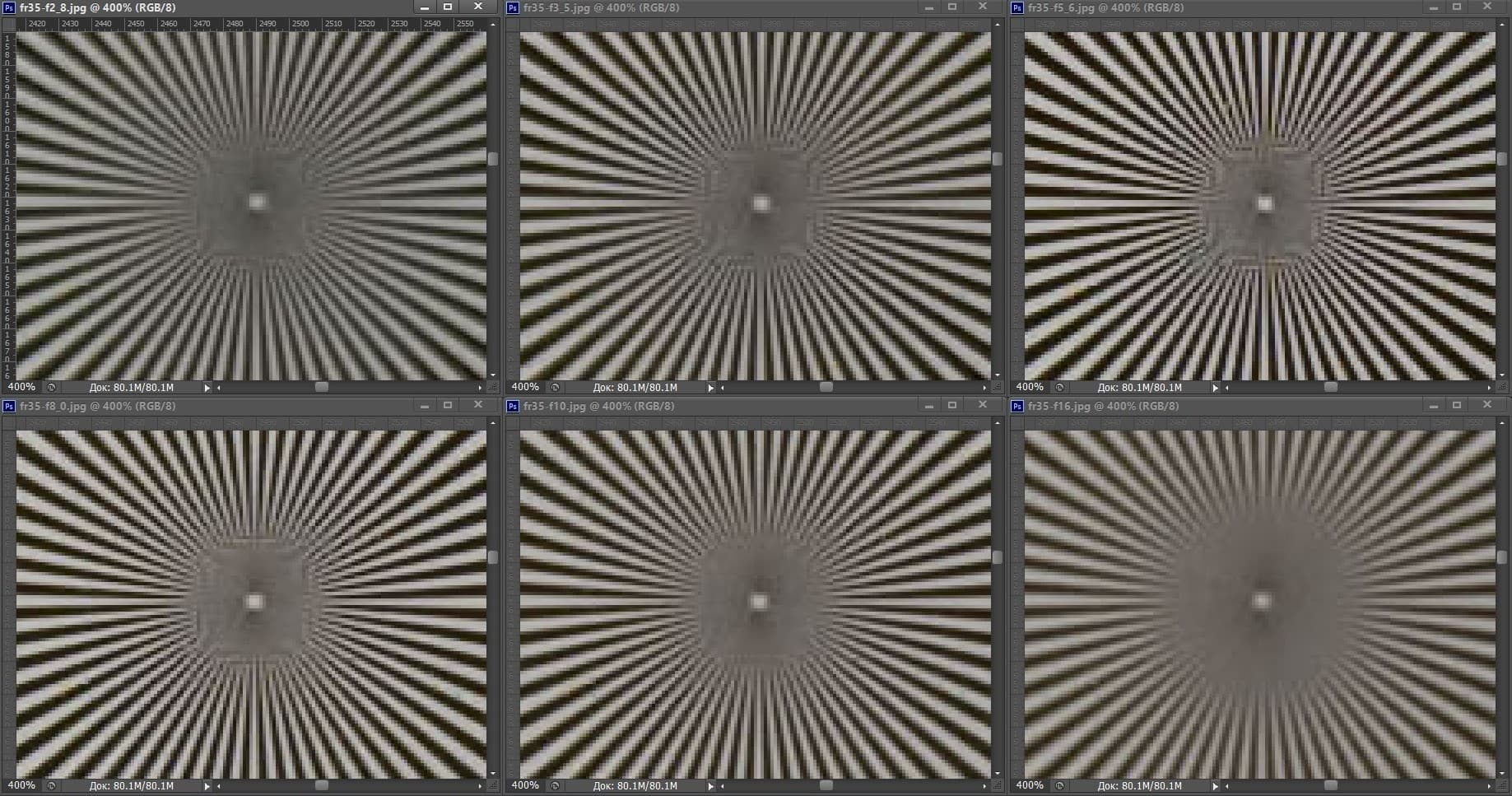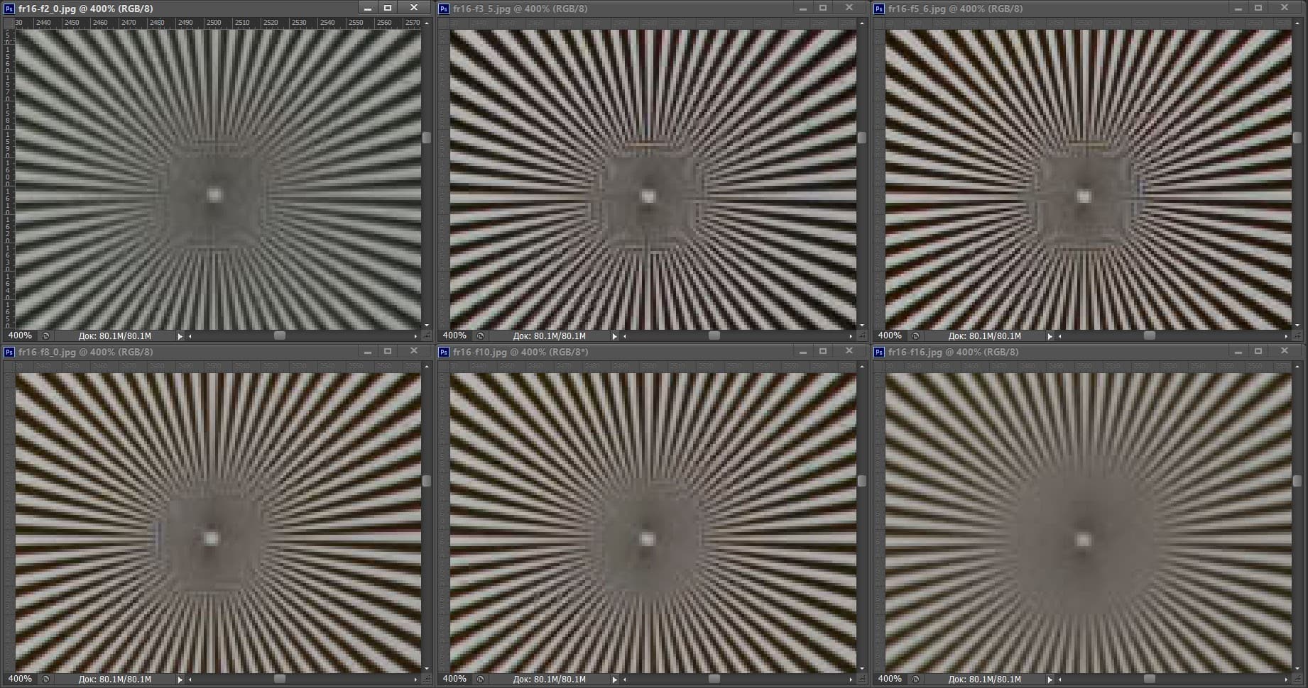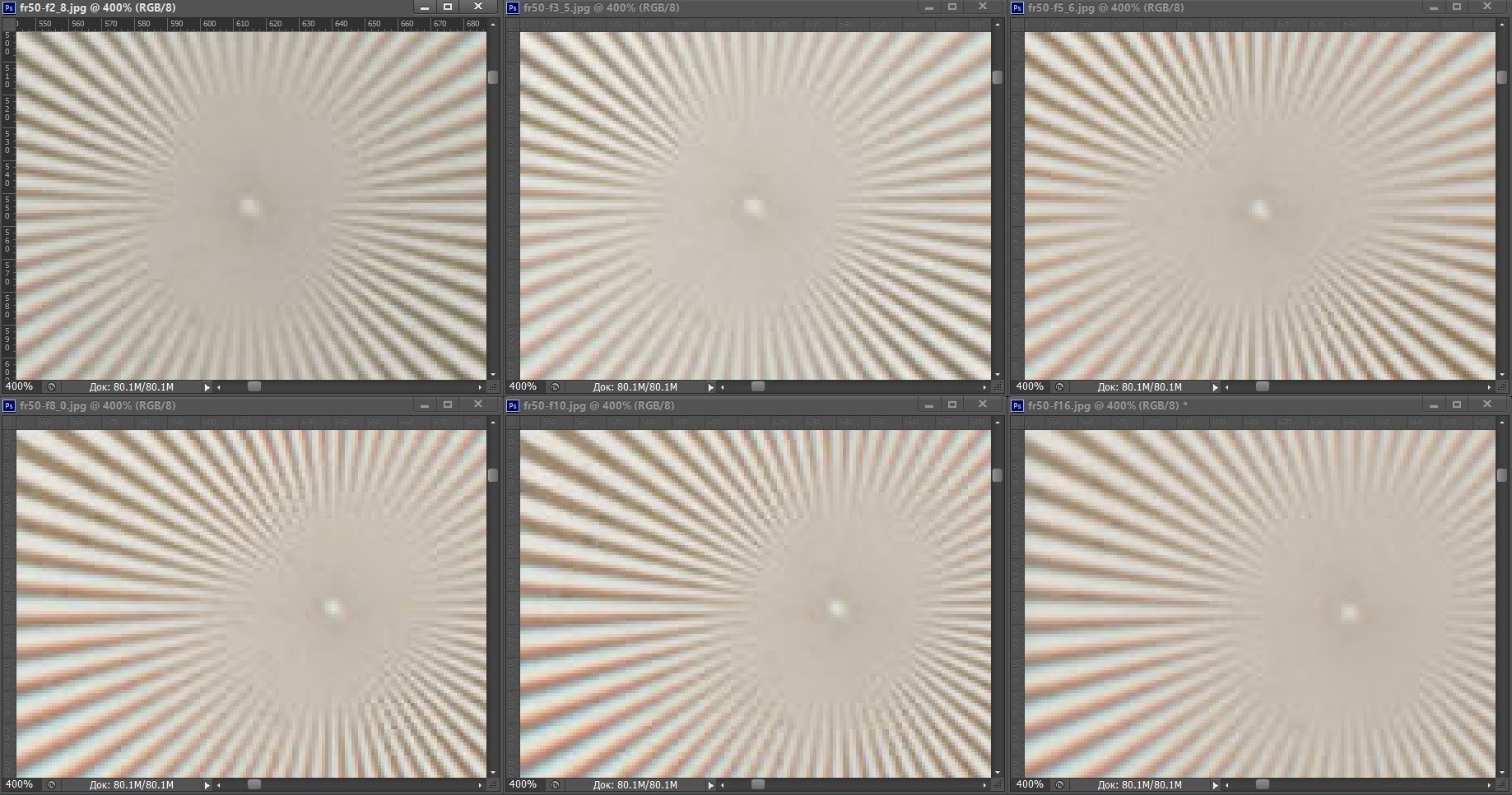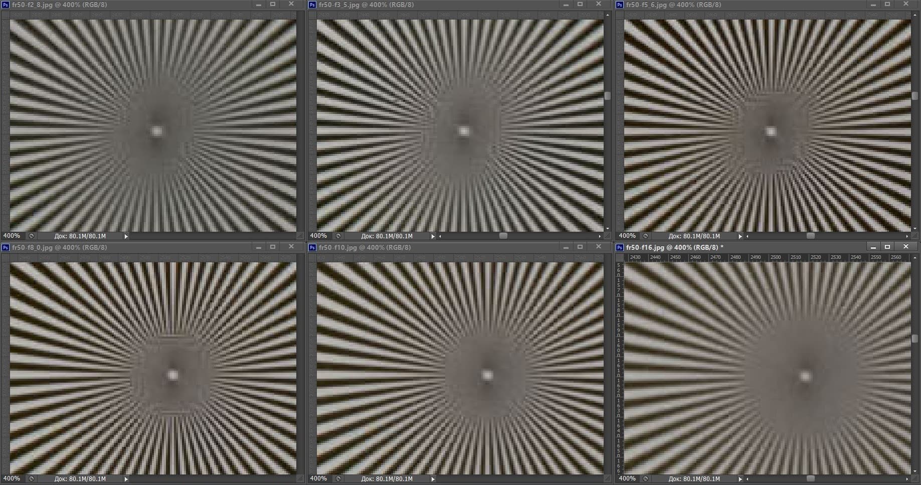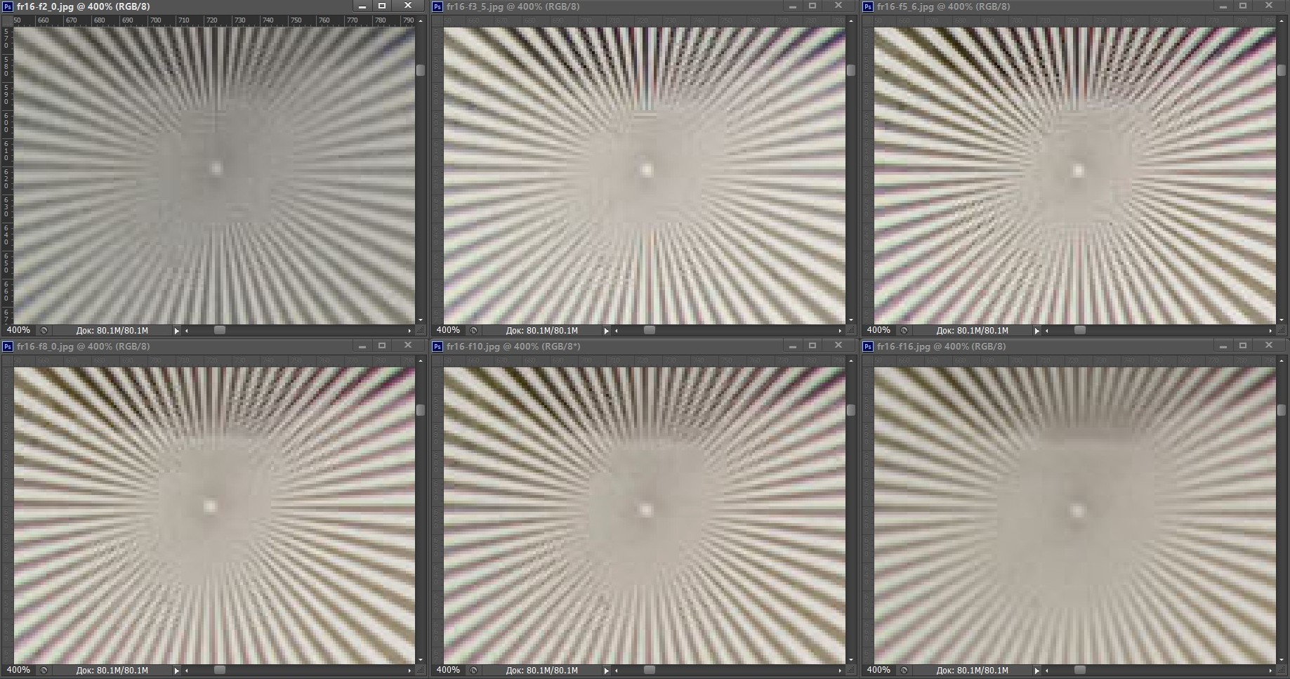 | На всех скриншотах: верхний ряд: f/2,8 — f/3,5 — f/5,6; нижний ряд: f/8 — f/10 — f/16 | |||