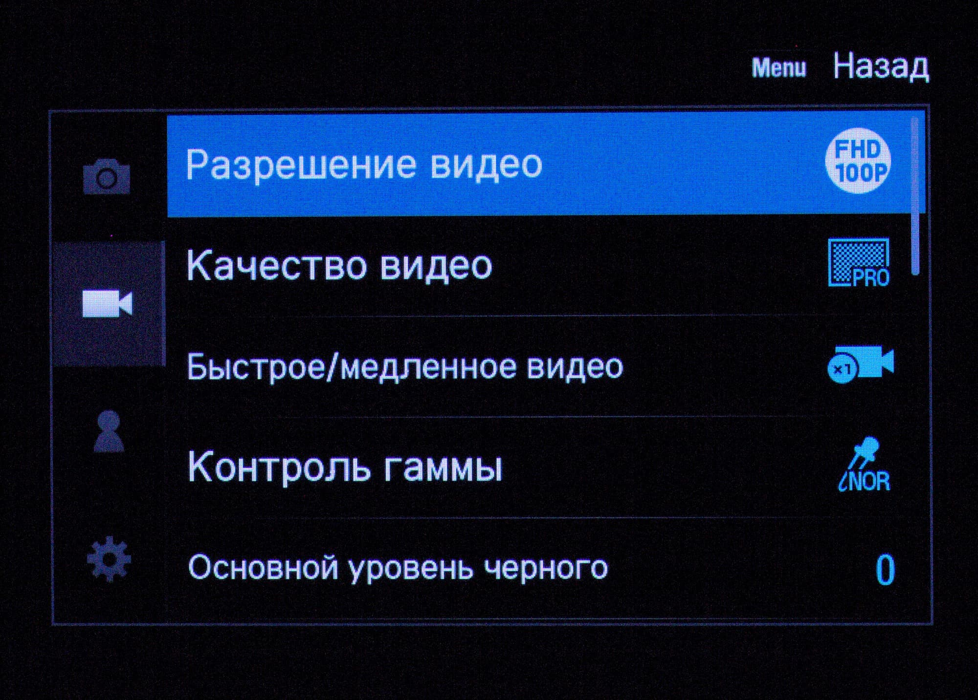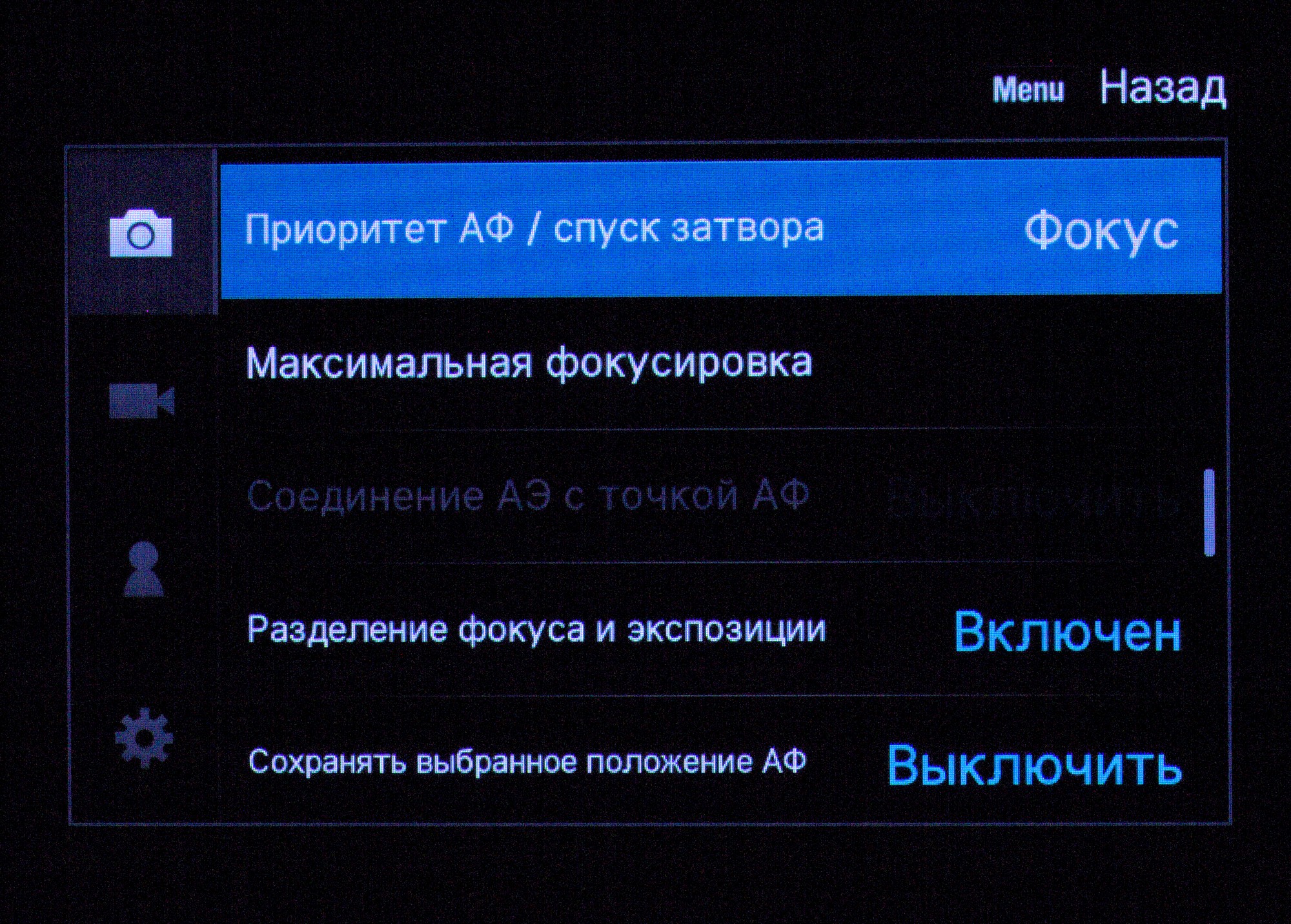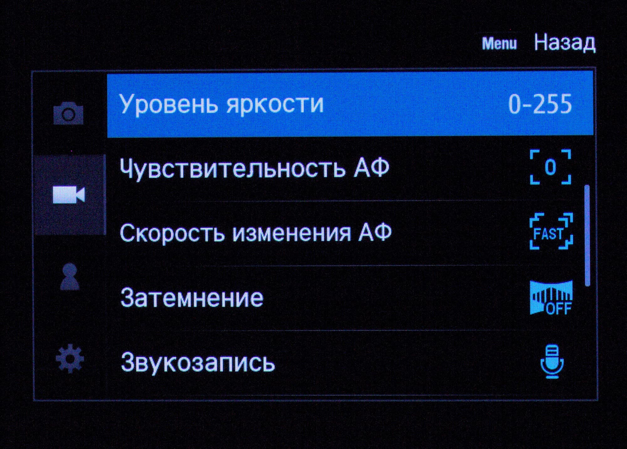 В меню очень богатый выбор настроек — можно сказать, полупрофессиональный. Приятно, что можно настроить практически любой орган управления на выполнение любой функции. Таким образом, после десяти минут переназначений можно ощутить в правой руке, к примеру, привычный Canon, которым можно пользоваться вслепую — а иначе для настройки ISO и ББ придется подключать левую руку.