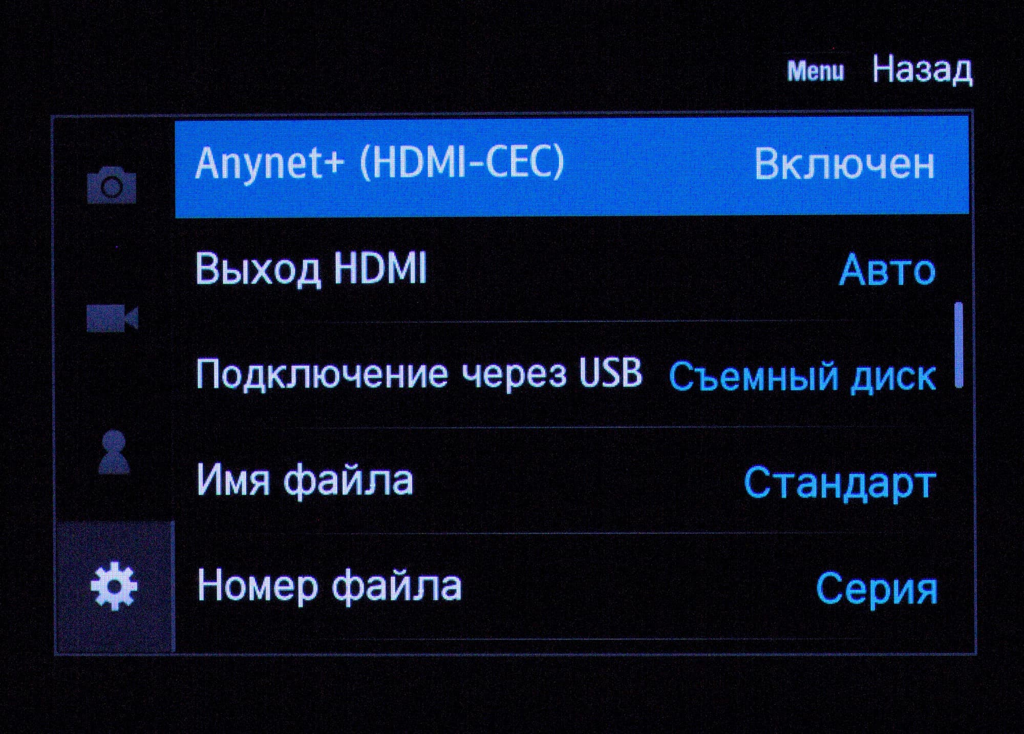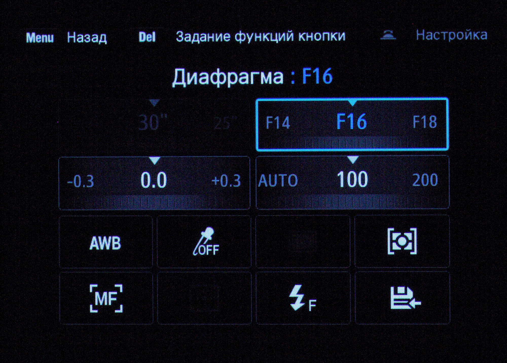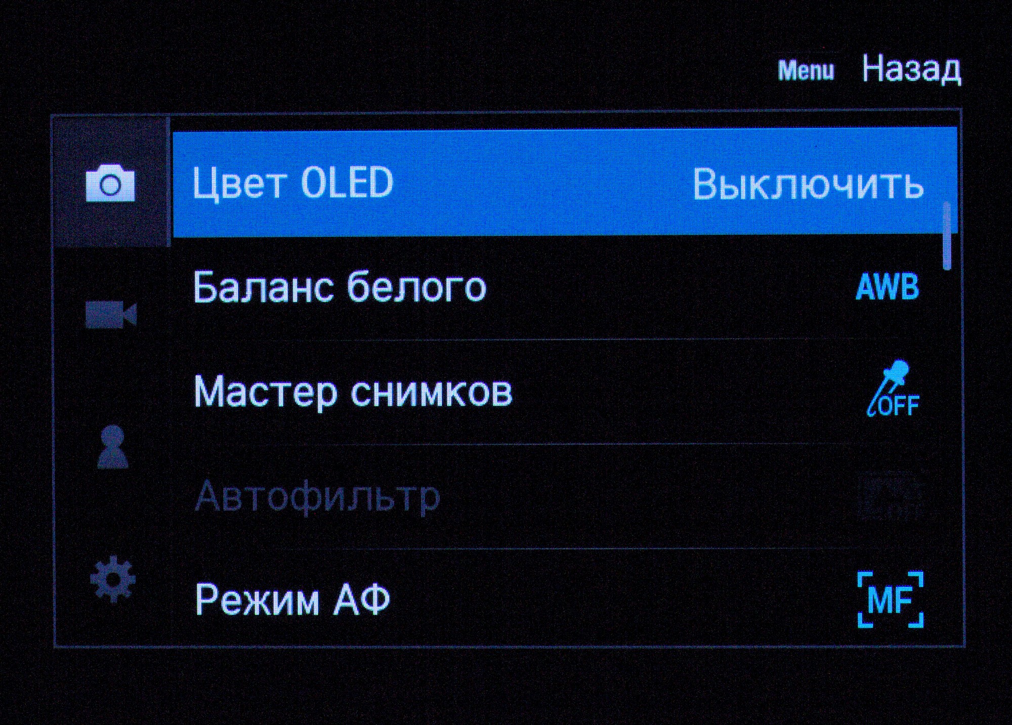 В меню очень богатый выбор настроек — можно сказать, полупрофессиональный. Приятно, что можно настроить практически любой орган управления на выполнение любой функции. Таким образом, после десяти минут переназначений можно ощутить в правой руке, к примеру, привычный Canon, которым можно пользоваться вслепую — а иначе для настройки ISO и ББ придется подключать левую руку.