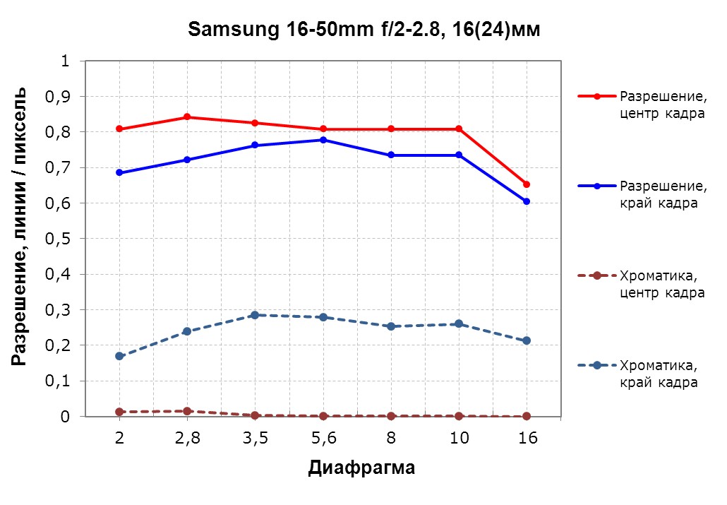 Максимальное фокусное расстояние «роняет» разрешение на краю кадра на совсем низкий уровень. Правда, с ним же опускается и уровень хроматики. Центр кадра сохраняет достаточно высокое разрешение и низкий уровень хроматики практически во всем диапазоне фокусных расстояний.