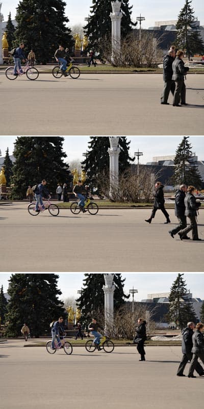 Скорость съемки, на мой взгляд, единственное в чем камера уступает недорогим зеркалкам. Отставание по скорости фокусировки не такое уж и существенное. Скорость фокусировке как раз соответствует стилю съемки по дисплею «на вытянутых руках». В принципе, под любой предсказуемый сюжет можно приноровиться и не упустить момент. Отставание в скорости более заметно по возможности серийной съемки в RAW и реакции камеры на нажатия кнопок управления. Если снимать RAW и JPEG, то в серии может быть только 3 снимка. При этом скорость съемки ограничена вполне приличным значением 3 к/с. При съемке в JPEG ограничения в количестве снимков в серии нет. Но после нескольких снимков скорость замедляется и возможны небольшие паузы. Далее приведены уменьшенные снимки серии с неспешно едущими велосипедистами. Очевидно, что поймать момент вполне возможно: