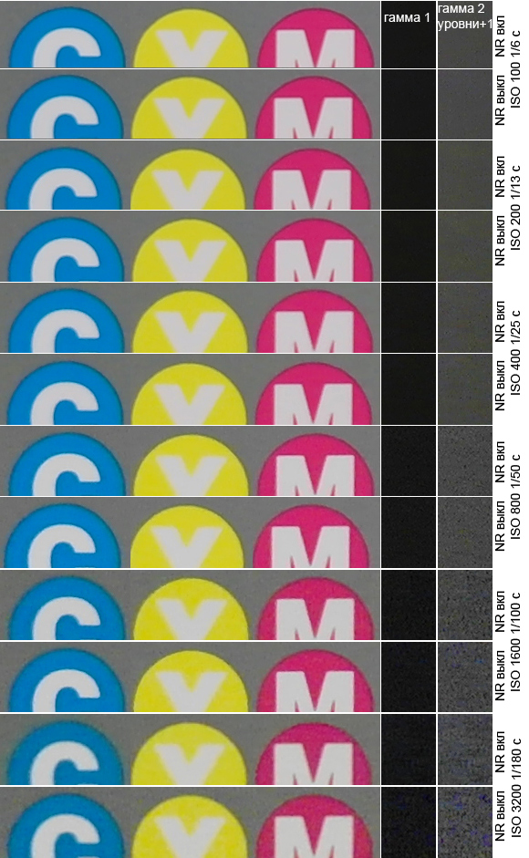 Для оценки качества изображения производилась съемка мишени Kodak Q13 и штриховой миры при освещении их лампами дневного света. Так как настройки шумоподавления, описанные в меню, мне показались несколько необычными — почему только при ISO 3200 производится шумоподавление, во всем диапазоне ISO тестовая съемка выполнялась с включенным и выключенным подавлением шумов.