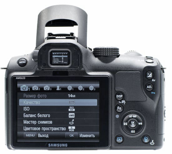 Samsung NX10 — 14,6 Мп камера со сменной оптикой и электронным видоискателем. Так как оптического видоискателя с зеркалом и призмой для прямого визирования через объектив у нее нет, корпус получился существенно более компактным, чем у зеркалок. Отсутствие зеркала позволило максимально приблизить объектив к матрице. Что, в свою очередь, дает возможность делать короткофокусные объективы более простыми и компактными, чем у камер с зеркальной системой видоискателя.
