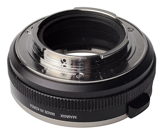 Переходник довольно любопытный, поскольку имеет кольцо, связанное с толкателем, закрывающим диафрагму объектива. Причем есть фиксация промежуточных положений. В отличие от системы micro 4/3, переходников на автофокусные объективы у системы NX пока нет. Предполагается, что есть некоторые правовые проблемы, которые то ли будут решены, то ли нет. Впрочем, даже в рамках автоматизации работы с объективами для механических камер, фирма могла бы блеснуть и сделать электрический привод толкателя, это уж точно ничьих прав не задевает. Это, возможно, нас ждет еще впереди, поскольку на сегодняшний день поддержка объективов, установленных через переходник, реализована очень плохо, существенно хуже, чем в системе micro 4/3. Невозможно включить электронную лупу для точной фокусировки, и по непонятной причине, хотя никакой электрической связи с объективом нет, камера заносит в заголовок EXIF диафрагму, взятую с потолка, при том, что поля, отвечающие за фокусные расстояния и светосилу, содержат нулевую информацию, что является естественным, когда камера не знает, какой объектив к ней подсоединен. Я надеюсь, что проблему электронной лупы с помощью обновления прошивки встроенного программного обеспечения фирма решит. Если же не решит, то кто-нибудь сделает «одуванчик», который будет включать электронную лупу. На сегодняшний день электронная лупа включается автоматически при повороте кольца фокусировки на штатных объективах. Ясно, что эту систему несложно обмануть, были бы энтузиасты и желание. Однако, судя по тому, что мы сегодня имеем, особо обнадеживать энтузиастов фирма не намерена.