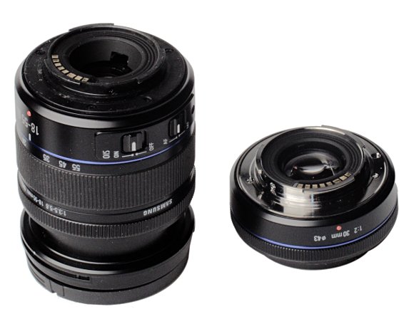 Система SAMSUNG NX комплектуется на сегодняшний день тремя объективами с рабочим отрезком 25,5 мм и байонетом с внешним диаметром 42 мм. Практически таким же, как у micro 4/3, однако с более широкой проточкой, что не позволяет случайно перепутать объективы, — так сказать, защита от дурака. Кроме того, фирма SAMSUNG выпустила переходник MA9NXK для использования объективов с байонетом K и ручной фокусировкой.