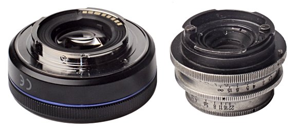 Сравните отношение диаметра байонета к диаметру объектива у классического объектива TESSAR 50 и объектива Samsung