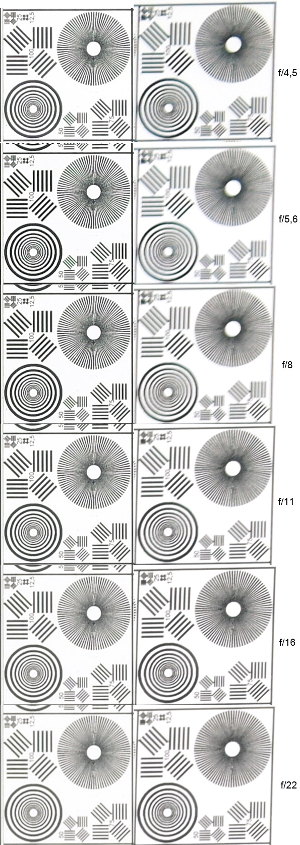 Для оценки качеств изображения камерой, с установленным на нее объективом Samsung 18—55 мм F3,5—5,6 OIS iFn (фокусное расстояние при съемке миры — 33 мм / экв. 50 мм), была выполнена съемка мишеней, состоящих из штриховых, радиальных и кольцевых мир и мишени Kodak Q13. Настройки камеры при съемке: JPEG, максимальное разрешение / наилучшее качество, фильтр понижения шума — «выключено», «Мастер снимков» — «Стандарт». Освещение — лампы дневного света, настройка баланса белого — по серой мишени. Выдержки короткие. Для каждой установки диафрагмы при съемке миры производилось три снимка, из которых для конечной картинки выбирался лучший.