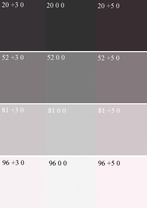Небольшой сдвиг в канале цветности хорошо заметен на глаз, особенно когда шкалы рядом. Но даже на калиброванном мониторе сложно увидеть сдвиг цветов, если закрыть «чистые» серые поля. Хотя преобразование из Lab в sRGB не линейное, можно считать, что сдвиг на 5 единиц в любом из каналов RGB будет так же заметен. Попытаемся настроить изображение получаемой со сканера так, чтобы точность передачи серого была как можно выше, приняв ошибку в среднем в 2-5 единиц допустимой. Разброс в 2-5 единицы характерен и для различных версий цифровых шкал GretagMacbeth ColorChecker, промеренных разными авторами.