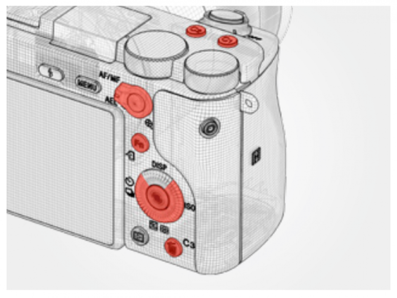 Десять органов управления Sony α6500 можно переназначить для выполнения тех или иных операций по своему усмотрению (у Sony α6300 таких девять). На схеме ниже они помечены красным.