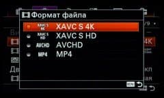 | Форматы записи видео | XAVC S/AVCHD 2.0/MP4, во всех случаях видео MPEG-4 AVC/H.264 |