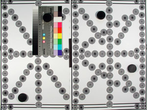 Качество изображения (разрешение, дисторсия, хроматические аберрации) оценивалось по результатам съемки тестовой мишени Kodak Q13 и мишени с мирами (70×45 см, съемка в полный кадр).