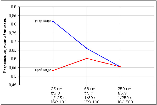 По мере закрытия диафрагмы, увеличения чувствительности и фокусного расстояния разрешение в центре довольно резко падает, а на краю плавно возрастает. При максимальном зуме разрешения равны, что достаточно неплохо и вполне закономерно. Хотя само значение относительного разрешения в этом случае невысокое.