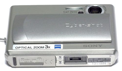 Очевидно, что для такого конструктива было важным обеспечить фокусировку без изменения толщины камеры. Вот почему DSC-T1 оборудован встроенным объективом с оптикой Carl Zeiss Vario-Tessar специальной конструкции — с призмой, обеспечивающей 3х зум без выдвижения из корпуса.