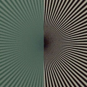 Совмещены два изображения миры, расположенной в левом верхнем углу кадра (слева) и в центре кадра (справа). Фокусное расстояние F=13 мм; диафрагма F/2,2; индекс экспозиции ISO-64. При таком фокусном расстоянии разница между центром и краем кадра почти не заметна, одна если уменьшить фокусное расстояние в 2 раза, ситуация перестает быть столь радужной, хотя и остается предсказуемой.