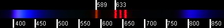 На снимке видны фраунгоферовы линии. Приведенный снимок уменьшен примерно в два раза и усреднен по вертикали. (Исходный кадр — 1,2 МБ). Линия Кислорода 762,1 нм просто бросается в глаза, но можно идентифицировать и еще несколько главных фраунгоферовых линий: Водорода — 486,1 нм и 658,3 нм; серию неразличимых между собой линий Магния— 516,7 нм, 517,3 нм, 518,4 и Железа — 616,7 нм, 516,9 нм; Железа — 527 нм; Натрия — 598,6 нм; Кислорода — 687 нм, 718,5 нм, 762,1 нм.