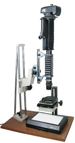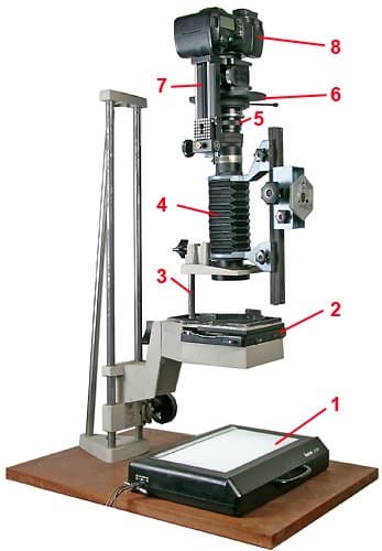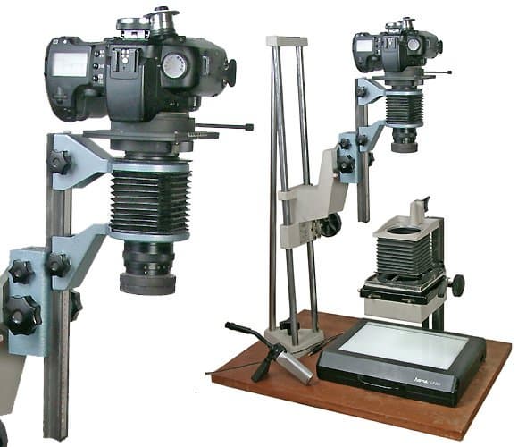 Устройства можно разделить на две основных группы: установки для пересъемки 1:1 и фотоувеличители. На нижеприведенной фотографии изображена классическая конструкция, состоящая из аппарата Зенит, приставки для макросъемки ПЗФ, объектива Гелиос-44 и приставки диарепродукционной ПД.
