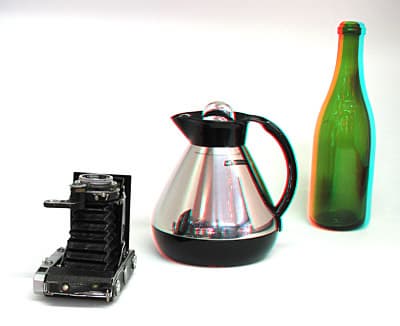 Для получения объемного эффекта не обязательно иметь стереопару. К примеру, на приведенной ниже анаглифной фотографии просто немного сдвинут красный канал вправо. Если смотреть на нее через цветные очки, то фотоаппарат будет «висеть» над дисплеем или за ним, в зависимости от того, как вы оденете очки (красный на левом, синий на правом или наоборот).