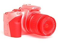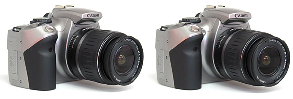 После сделайте пару фотографий и расположите их рядом. (Как приведенные выше снимки фотокамеры.) Левый глаз и камера, снимавшая левый вид, почти не видит фонарь подсветки фокусировки, а правый глаз и его камера видят. Так же правый вид воспринимается более коротким. В таких искажениях и деталях и кроется стереоэффект. Натренированные глаза без особого труда метров с 2 совместят два снимка в один и, не обращая внимания на боковые виды, в центре увидят объемную камеру Canon 300D. (Фотографию вверху лучше уменьшить, чтобы не отходить от монитора и разглядывать, поместив между видами перегородку из непрозрачного материала, можно взять и стереоочки из комплекта цифровых камер Pentax).
