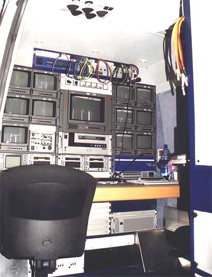 Как и в прошлом году, значительный интерес у посетителей выставки вызывали мобильные комплексы (ПТС-передвижные телевизионные станции) для организации съемок и ведения репортажей непосредственно с места событий. Ограниченное пространство и необходимость разместить много разнообразного оборудования делают проектирование и монтаж подобной системы исключительно сложной задачей, и фирмы, имеющие такой опыт, по праву им гордятся. В этом году на выставке были представлены целых две ПТС на базе микроавтобусов.