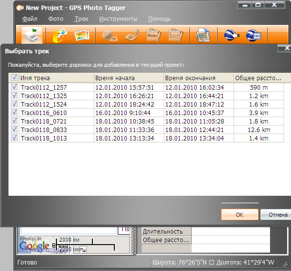 GPS Photo Tager предназначен для просмотра и редактирования лог-файлов (в формате NMEA), просмотра миниатюр фотографий, синхронизации их с лог-файлами, записи GPS координат в EXIF заголовки JPEG файлов, конвертирования NMEA лог файлов в файлы других форматов. Исходные данные программа может получать от приемника (по USB), считывателя micro SD карты памяти, на которых содержаться лог-файлы, ранее созданных самой программой проектов. Загрузить в программу NMEA файлы, которые были скопированы на жесткий диск компьютера, мне не удалось. Для использования всех возможностей программы необходимо подключение к интернет и установленный Google Earth.
