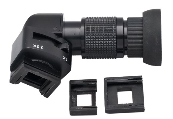 А можно воспользоваться угловым видоискателем, который совмещает, как возможность смотреть под прямым углом к оптической оси объектива, (что может быть удобно, например, при съемке с крайней нижней точки), так и возможность одним движением переключателя изменить увеличение и рассматривать центральную часть кадра с 2,5 кратным увеличением. Угловые видоискатели выпускаются практически всеми производителями зеркальных камер. Однако здесь я рассматриваю продукт стороннего производителя — фирмы OptiTech. В ассортименте фирмы несколько видоискателей, в данной статье я рассматриваю модель RH950.