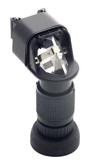 Оптическая схема большинства угловых видоискателей абсолютно идентична. Она представляет собой телескопическую насадку с призмой, поворачивающей и оборачивающей изображение: т. е. глядя в видоискатель, вы увидите прямое, а не зеркально отраженное изображение, как было бы, если бы для поворота на 90 градусов использовалось зеркало.