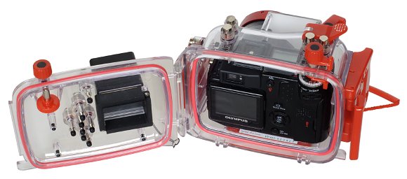 OLYMPUS PT-015. Снизу к штативному гнезду привинчен груз, обеспечивающий нейтральную плавучесть камеры.