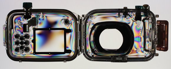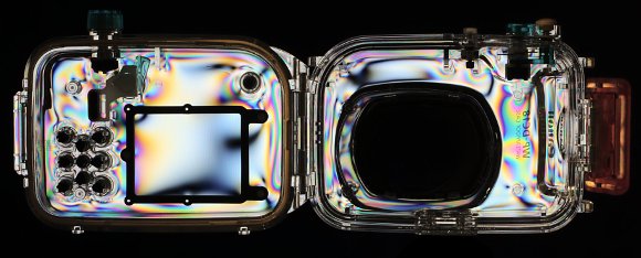Во всяком случае, при атмосферном давлении претензий к креплению иллюминатора нет, а вот остаточные напряжения в корпусе дают за счет фотоупругого эффекта весьма красочную картинку. Впрочем, 4 атмосферы не слишком большое давление, и есть надежда, что они не повлияют на прочность корпуса.