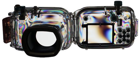 Отличие между этими двумя боксами, в первую очередь, определяется конструкцией камер, для которых они предназначены, их размерами и расположением кнопок. Из узлов, к которым фирмы подошли по-разному, можно выделить передний иллюминатор, который у Olympus круглый и имеет резьбу для крепления внешних насадок, также у Olympus есть съемная шахта для ЖК-экрана и, наконец, различаются конструкции светорассеивателя для встроенной вспышки. У Olympus это жестко закрепленная прямоугольная молочная пластина, а у Canon — съемная пластина хитрой формы, которая крепится вблизи самого иллюминатора. Эксперименты на воздухе показали, что этот светорассеиватель уменьшает ведущее число вспышки практически в два раза. Если ведущее число камеры Canon 650 IS в моих измерениях равно 7, то с боксом — около 4. Другими словами, со встроенной вспышкой при минимальной чувствительности и, соответственно, минимальных шумах удастся снимать объекты, расположенные не далее метра.