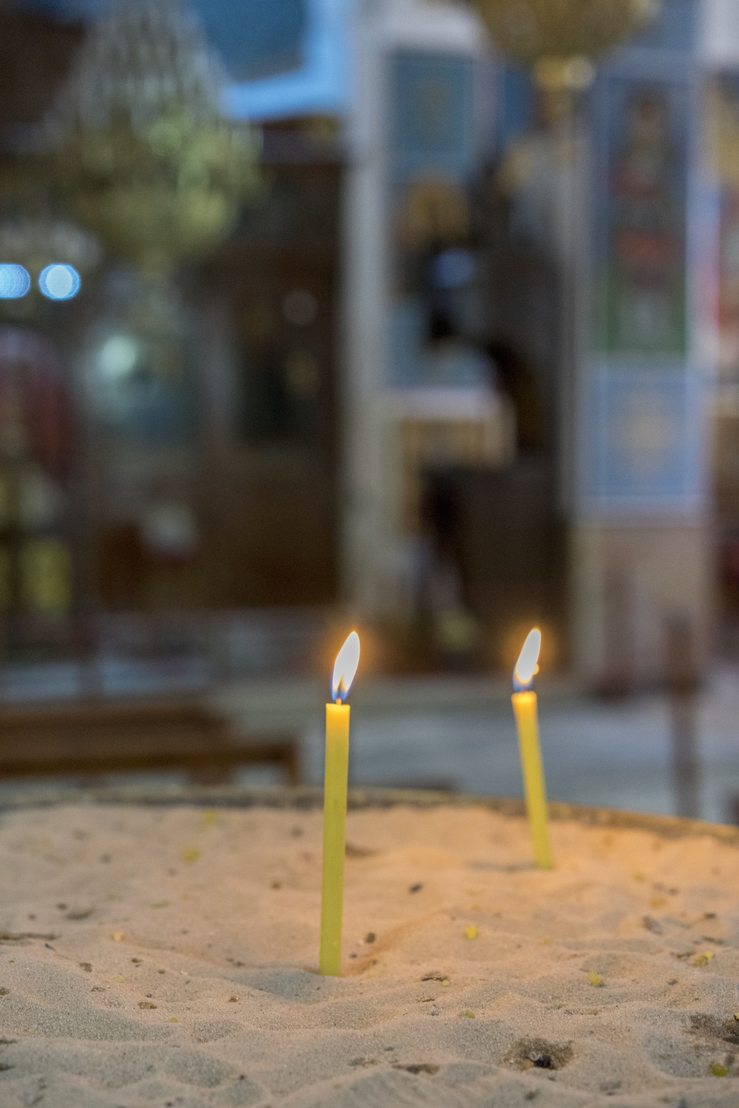 Объектив диафрагмирован из-за боязни получить бесформенное пятно на месте свечей. Огни удались на славу: отлично видна структура пламени.