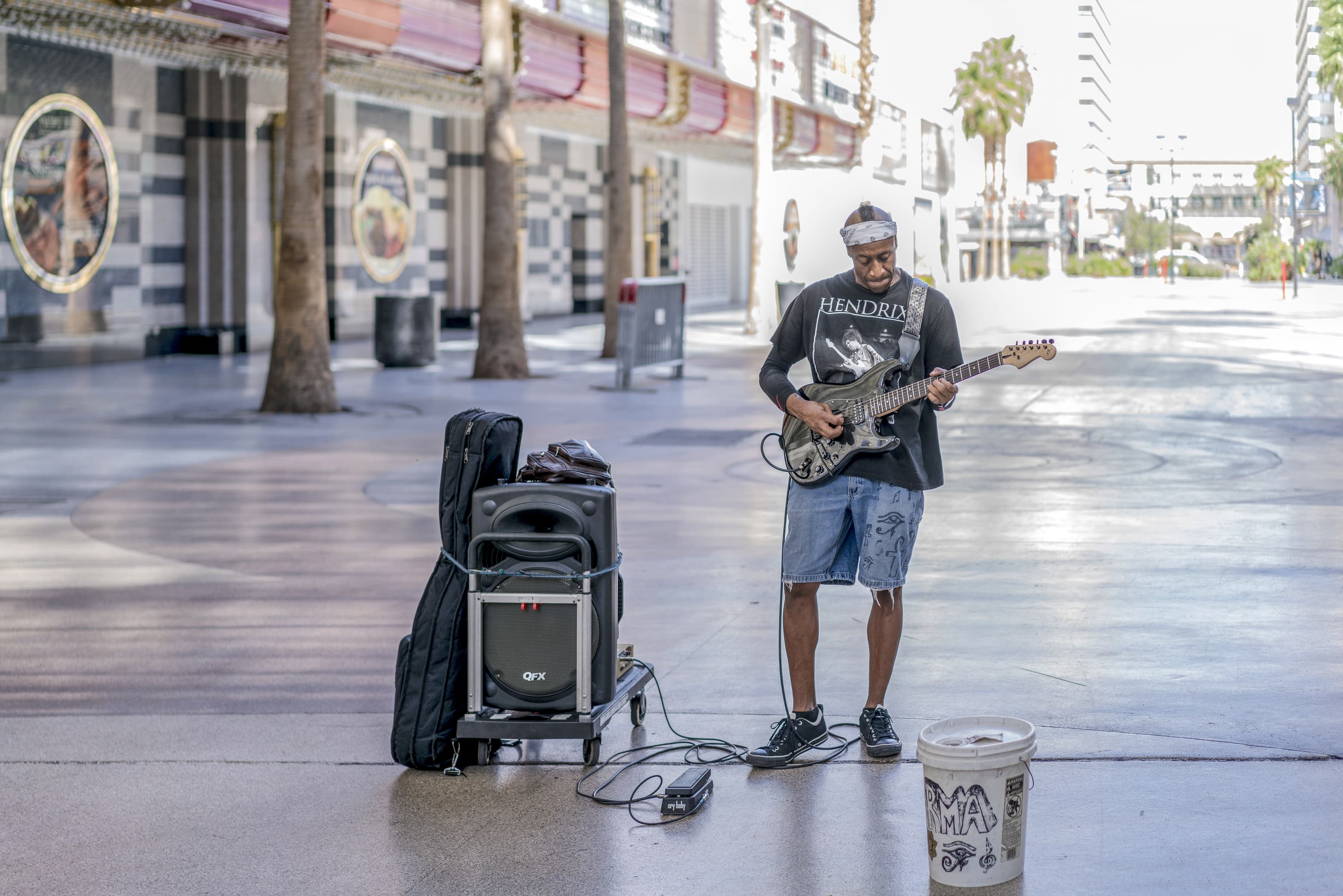 Нужно заметить, что играл этот гитарист весьма недурно, но на момент моего приближения к нему собрал вокруг себя лишь несколько человек. Пока я фотографировал, зеваки, очевидно, решили, что это постановочный сюжет «по заказу», и их число увеличилось до трех десятков. В крышку пластмассового ведра стали класть не никель и медь, а бумажки. Было приятно помочь бедному артисту материально, пусть из чужого кармана.
