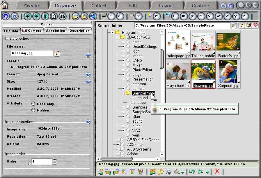 Здесь все предельно просто. Путешествуя по расположенному в центре окна дереву папок, пользователь находит нужные фотоснимки, свойства которых мгновенно отображаются в левом окне. С помощью находящихся в нижней части окна кнопок можно произвести ряд простейших действий: повернуть/отразить фотографию или распечатать ее.