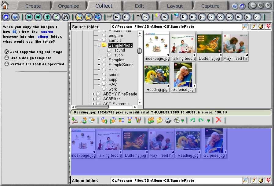 Перейдите на вкладку Collect. В дереве папок найдите нужные фотографии и начинайте перетаскивать их в копилку. При накоплении фотографий они будут выстраиваться в том порядке, в котором вы их разместили. Размер фотографий значения не имеет, равно как и формат файлов: программа умеет работать с большинством типов растровой графики.