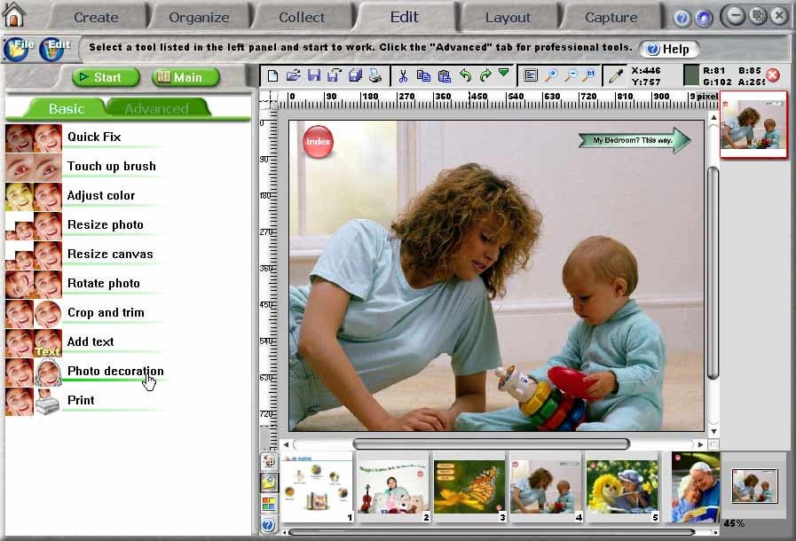 На вкладке Edit находятся инструменты, позволяющие произвести над фотографией действия с более тяжкими последствиями — не просто повернуть/отразить, но и изменить цветовую гамму, наложить текст, обрамить 3D-контуром, загнуть страницу и даже "натянуть" фотографию на объемный каркас (куб, шар, сердце).