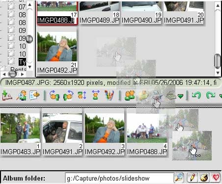Впрочем, достаточно и одной мышки — выделите фотографию, следующую за нужной, и немного переместите ее вправо: интервал между перемещенной и предыдущей фотографиями изменится, а, следовательно, и время отображения фотографии, находящейся перед этим интервалом, увеличится.