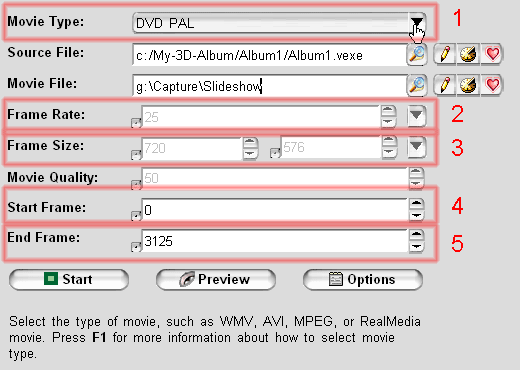 При выборе какого-либо формата открываются его подробные настройки, где можно выбрать частоту кадров в секунду (2), размер видеокадра (3), и, самое главное — начальный (4) и конечный экспортируемые кадры (5). Помните, мы записывали значение окна Current Position, выражаемое в секундах?
